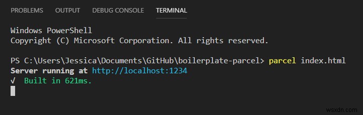 이것은 프로젝트를 빌드하고 https://localhost:1234/에서 로컬 개발 서버를 시작합니다. 이것에 대한 멋진 부분은 파일을 변경할 때마다 Parcel이 자동으로 로컬 사이트를 재구축하고 업데이트한다는 것입니다.